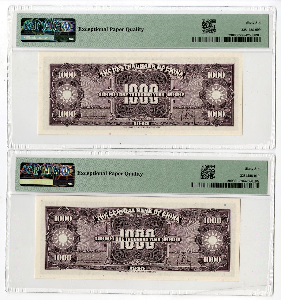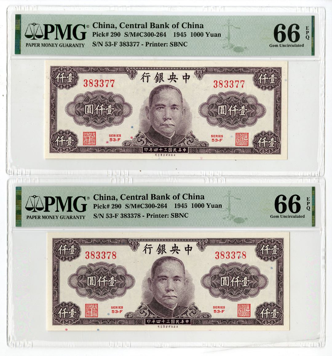 China, 1945. Lot of 2, 1000 Yuan, P-290 (2) S/MC300-264, issued sequential Banknotes, Purple print with SYS at center, S/Ns 53-F 383377 & 53-F 383378, Both are PMG graded Gem Uncirculated 66 EPQ, SBNC. (2). Sold "AS IS" no returns accepted.