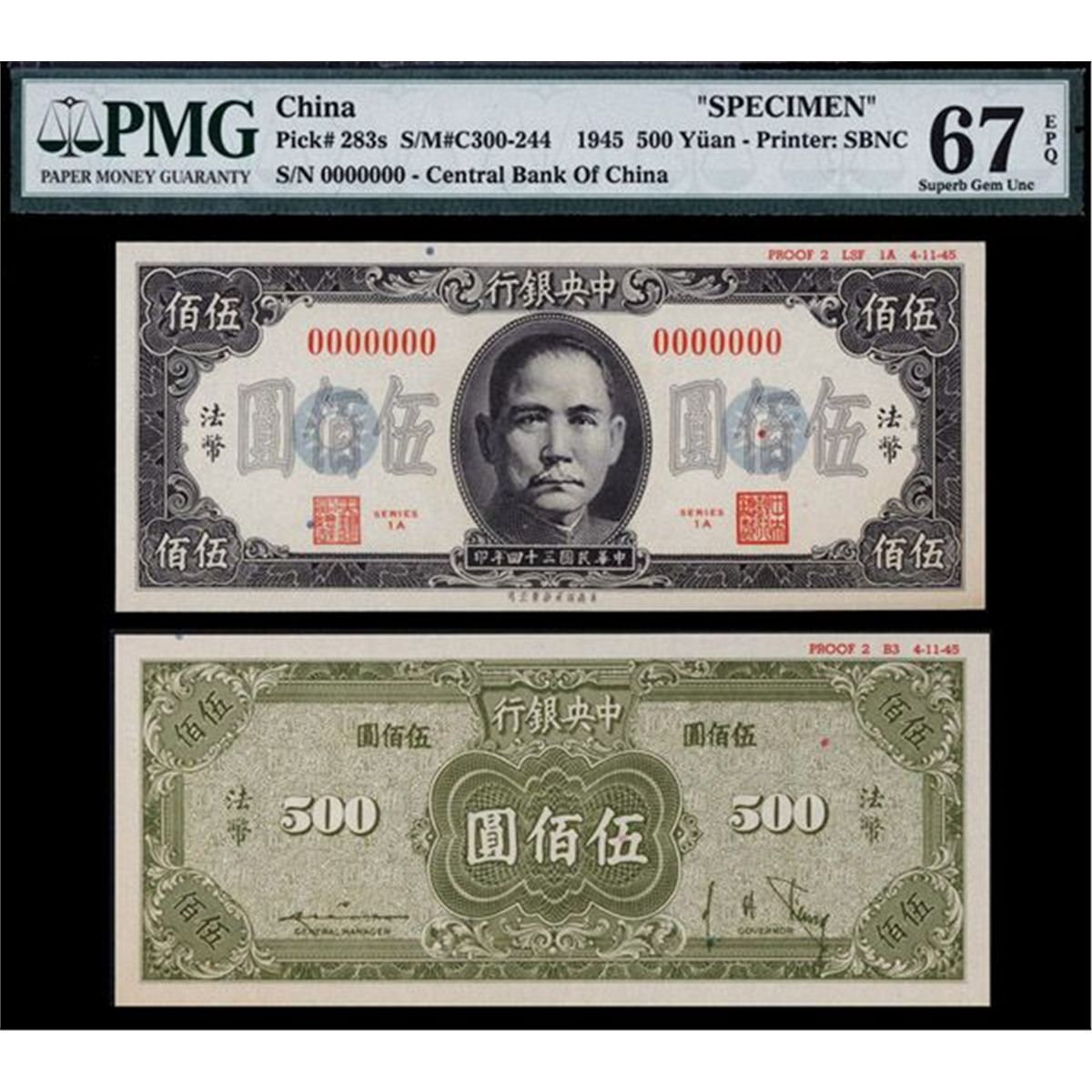 China, 1945, 500 Yuan, Series 1-A, P-283s, S/M#300-244, Specimen, SYS in middle, black on light ble and gray with red seals and signatures, back olive green, “000000” serial numbers, Small red archival printing on top right border margin PROOF 2 LSF 1A 4-11-45”, 8 Chinese character printer (SBNC), PMG graded Superb Gem Uncirculated 67 EPQ (Exceptional Paper Quality), relatively common note in very uncommon condition, SBNC.