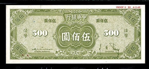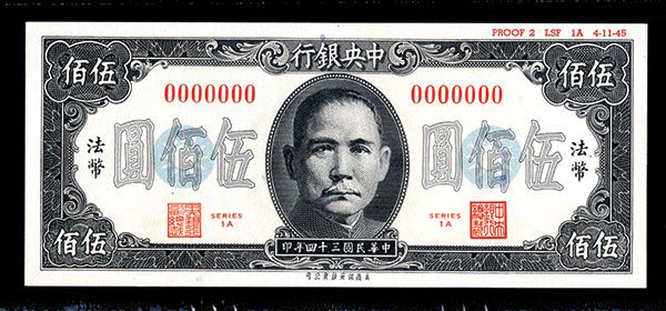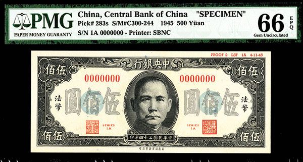 China, 1945, 500 Yuan, Series 1-A, P-283s, S/M#300-244, Specimen, SYS in middle, black on light ble and gray with red seals and signatures, back olive green, "000000" serial numbers, Small red archival printing on top right border margin PROOF 2 LSF 1A 4-11-45", 8 Chinese character printer (SBNC), PMG graded Gem Uncirculated 66 EPQ (Exceptional Paper Quality), SBNC.