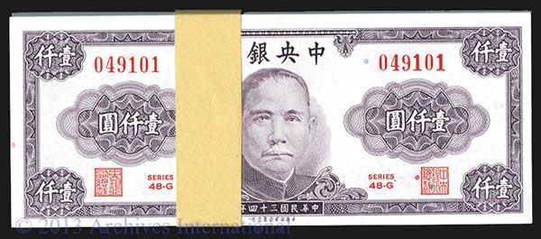 China. Lot of 100 notes, 1000 Yuan, P-290, Issued banknote, SYS at center, Purple, S/N 049101 to 049200. Condition varies from Uncirculated to Gem Uncirculated. Attractive and fresh appearing pack that deserves careful inspection and a superior bid. SBNC.