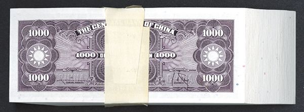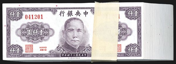 1000 Yuan, P-290, Issued banknote, SYS at center, Purple, S/N 046401 to 046500. Condition varies from Uncirculated to Gem Uncirculated. Attractive and fresh appearing pack that deserves careful inspection and a superior bid. SBNC.