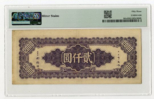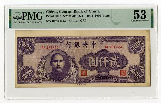 China, 1945. 2000 Yuan, P-301a, Issued Banknote, Dark purple on light purple underprint, SYS at left center, S/N BF421323, PMG graded About Uncirculated 53 with comment "Minor Stains," CPF.