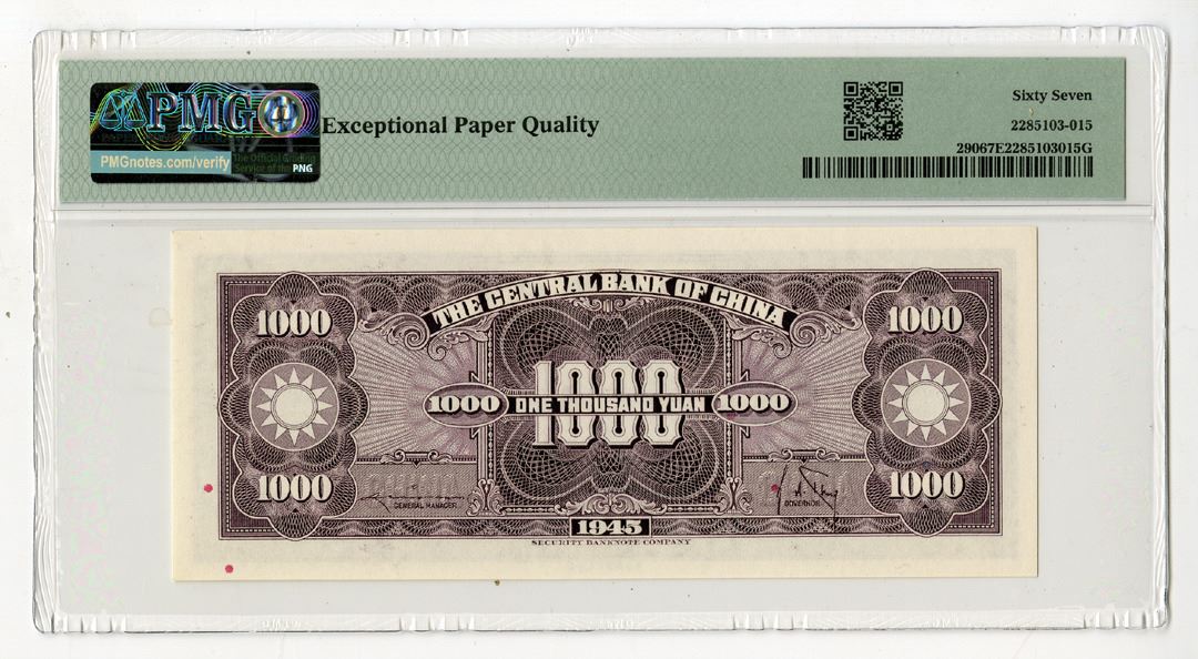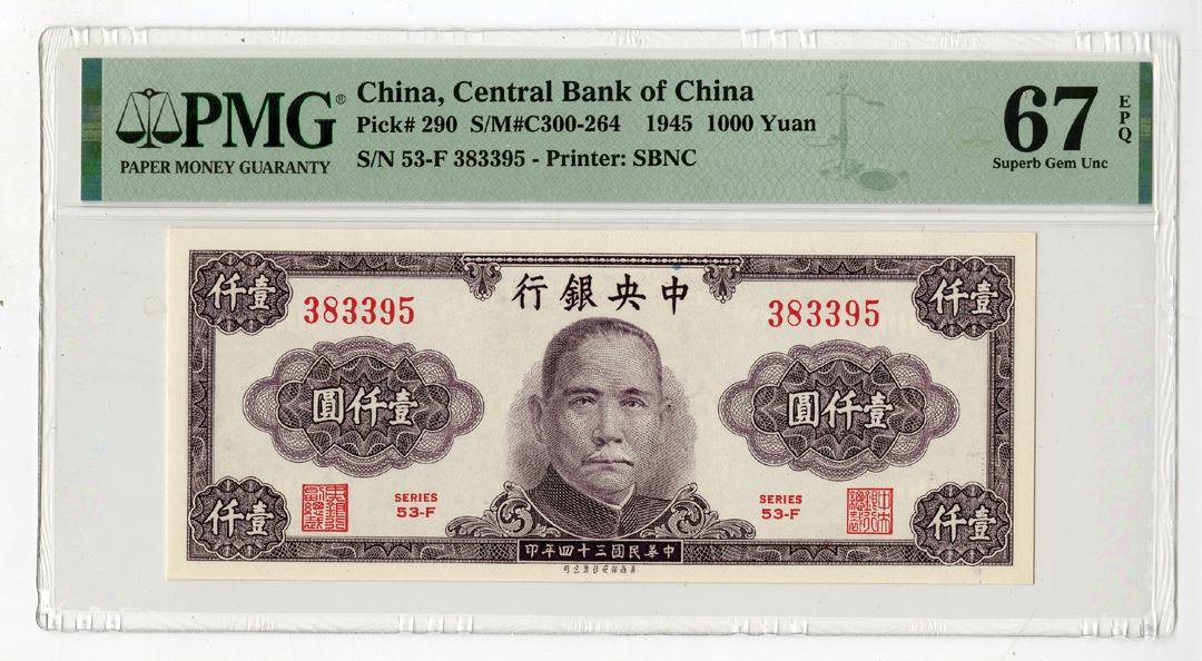 China, 1945. 1000 Yuan, P-290, S/M#C300-264, Issued Banknote, Purple with portrait of SYS at center, Back is purple with denomination and bank title at center, S/N 53-F 383395, PMG graded Superb Gem Uncirculated 67 EPQ, SBNC. Only 15 notes grade higher out of 3,339 Graded in the PMG census.