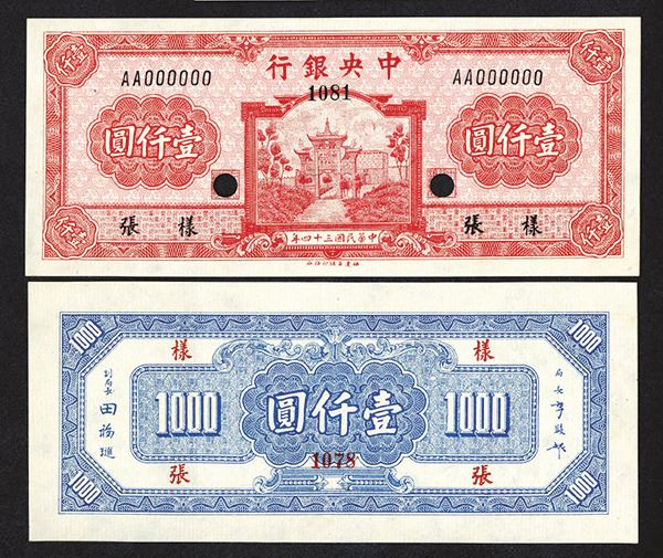 China, 1000 Yuan, P-296s, Unlisted as a specimen, Red with P'ai-lou Gate in middle, back blue, Specimen Chinese Characters, POC, S/N AA000000-1081, AU to Uncirculated, large even margins and fresh appearance. Chinese Printer 7 Characters. Also includes the original envelope that the notes were found in.