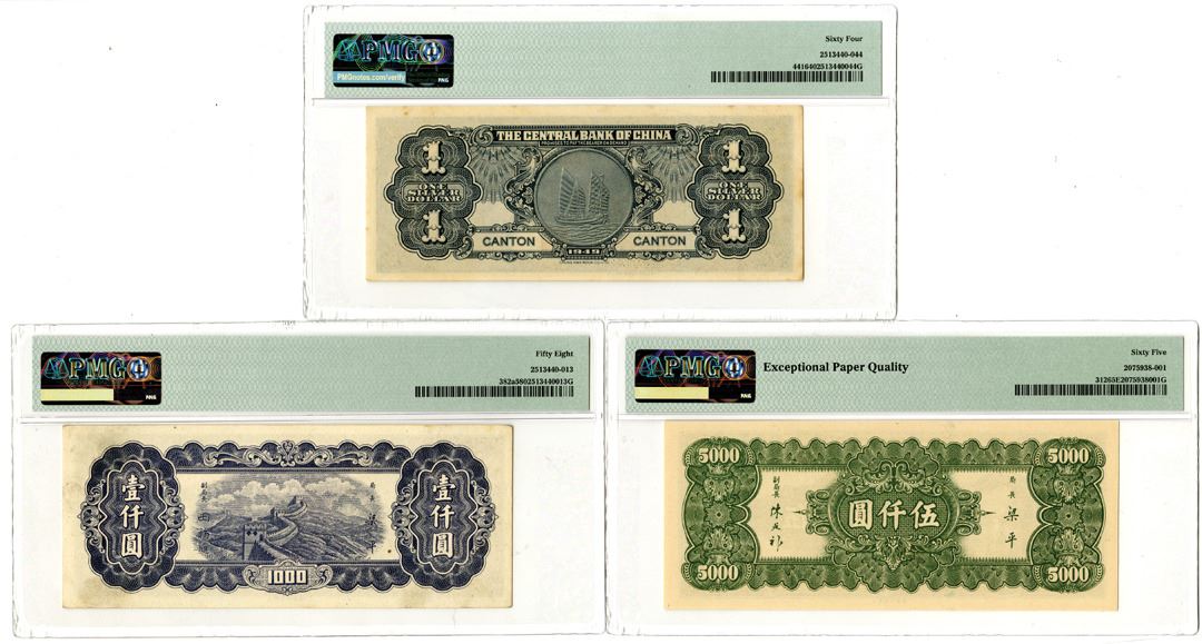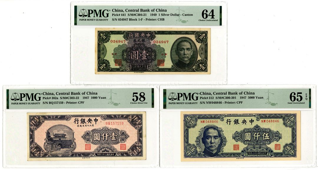 China. 1947-49. 3 Issued banknotes: 5000 Yuan, P-312 S/M#C300-301, PMG graded Gem Uncirculated 65 EPQ; 1000 Yuan, P-382a S/M#C303-22, PMG graded Choice About Uncirculated 58; and 1 Silver Dollar - Canton, P-441 S/M#C304-21, PMG graded Choice Uncirculated 64. (3)