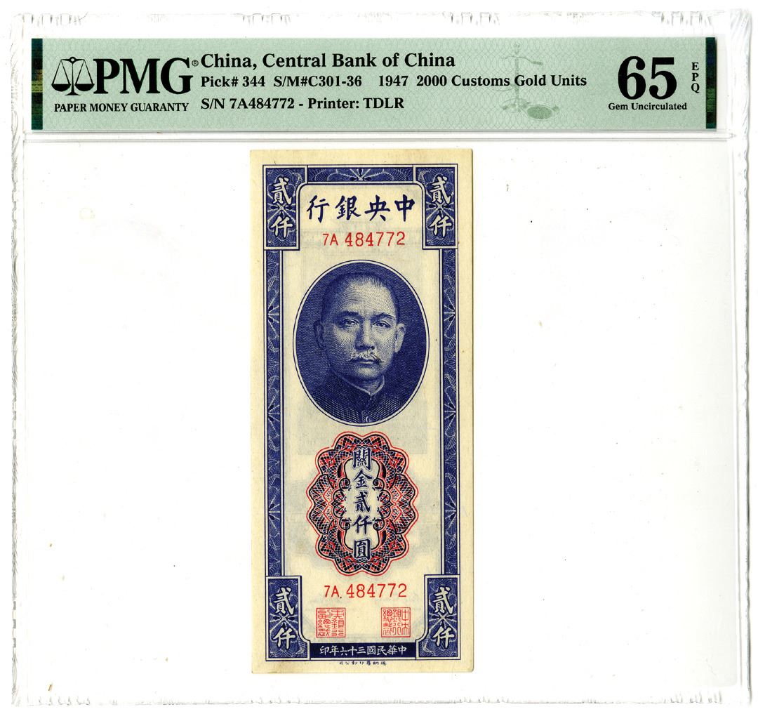 China, 1947. 2000 Customs Gold Units, P-344 S/M#C301-36, Issued Banknote. Blue and red printing with portrait of SYS at top in vertical format. S/N 7A484772. PMG graded Gem Uncirculated 65 EPQ. Printer: TDLR.