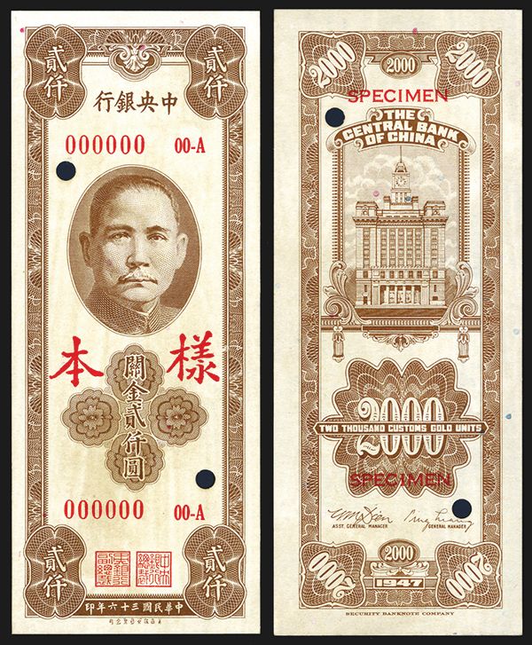 China, 1947, 2000 Yuan, P-236s, Unlisted as a Specimen in SCWPM. Uniface front and back specimens, Light brown on face with SYS at top, back light brown with bank building, Chinese Specimen overprint on face, "00000" serial numbers, Block 00-A, backs of both have light glue remnants from previous mounting that unfortunately bleed lightly through on the faces, otherwise the notes appear Uncirculated. SBNC. Rare as specimen.