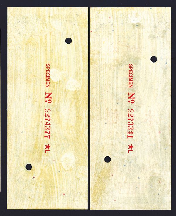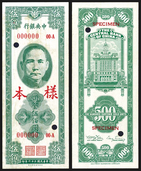 China, 1947, 500 Yuan, P-236s, Unpriced in SCWPM, Uniface front and back specimens, Green on face with SYS at top, back green with bank building, Chinese Specimen overprint on face, "00000" serial numbers, Block 00-A, backs of both have light glue remnants from previous mounting that unfortunately bleed lightly through on the faces, otherwise the notes appear AU-Uncirculated. SBNC. Rare as specimen.
