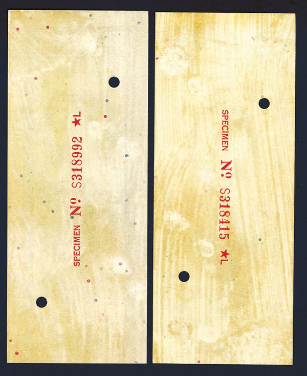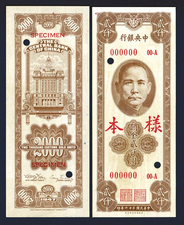 China, 1947, 2000 Yuan, P-236s, Unlisted as a Specimen in SCWPM. Uniface front and back specimens, Light brown on face with SYS at top, back light brown with bank building, Chinese Specimen overprint on face, "00000" serial numbers, Block 00-A, backs of both have light glue remnants from previous mounting that unfortunately bleed lightly through on the faces, otherwise the notes appear Uncirculated. SBNC. Rare as specimen.
