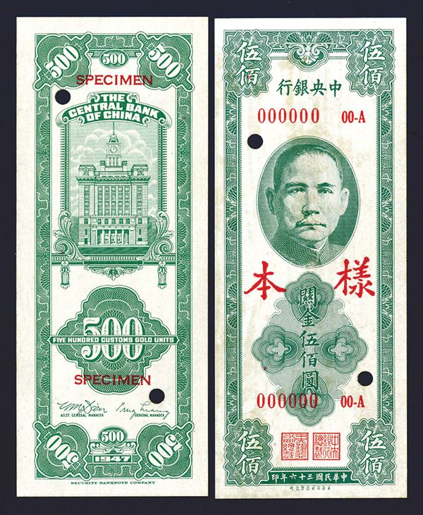 China, 1947, 500 Yuan, P-236s, Unpriced in SCWPM, Uniface front and back specimens, Green on face with SYS at top, back green with bank building, Chinese Specimen overprint on face, "00000" serial numbers, Block 00-A, backs of both have light glue remnants from previous mounting that unfortunately bleed lightly through on the faces, otherwise the notes appear AU-Uncirculated. SBNC. Rare as specimen.