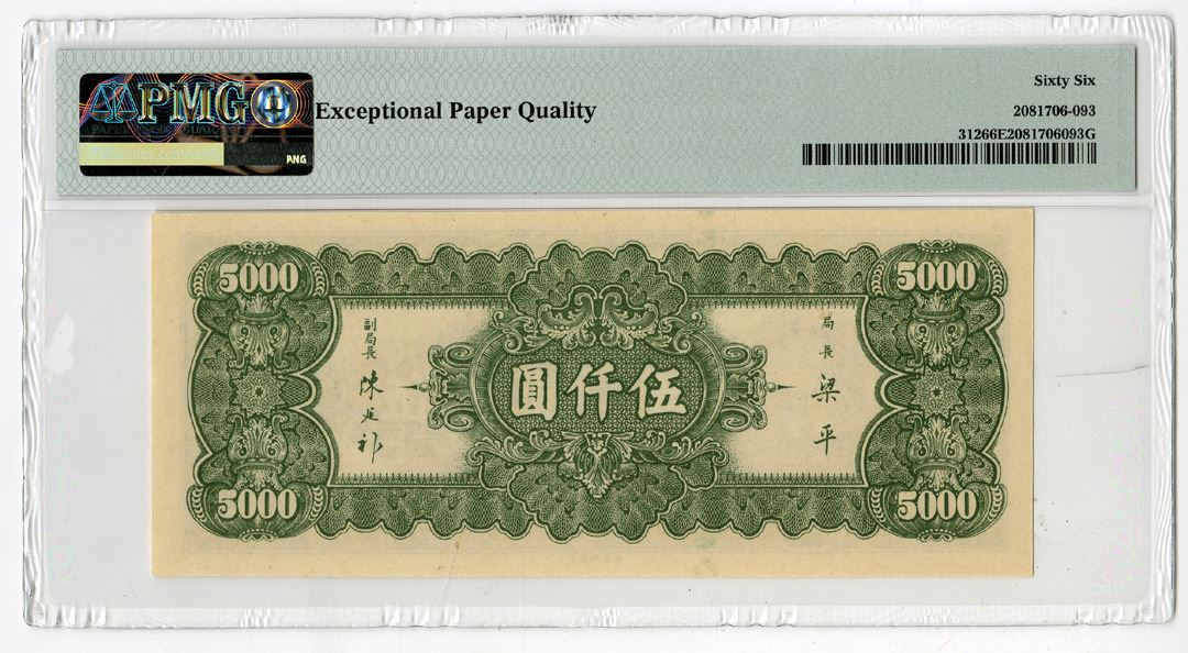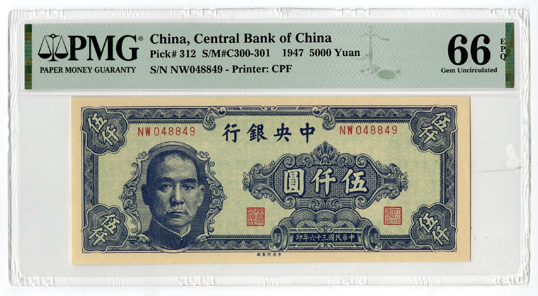 China, 1947. 5000 Yuan, P-312, S/M#C300-301, Issued Banknote, Blue on green underprint with portrait of SYS at left, S/N NW048849, PMG graded Gem Uncirculated 66 EPQ, Printer: CPF.