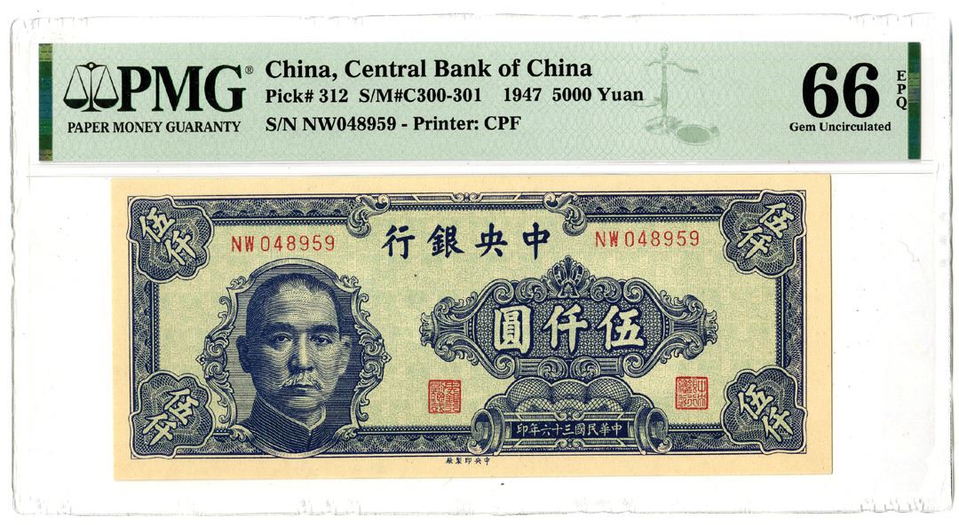 China. 1947. 5000 Yuan, P-312 S/M#C300-301, Issued banknote, blue on green, S/N NW048959, PMG graded Gem Uncirculated 66 EPQ. Printer: CPF.