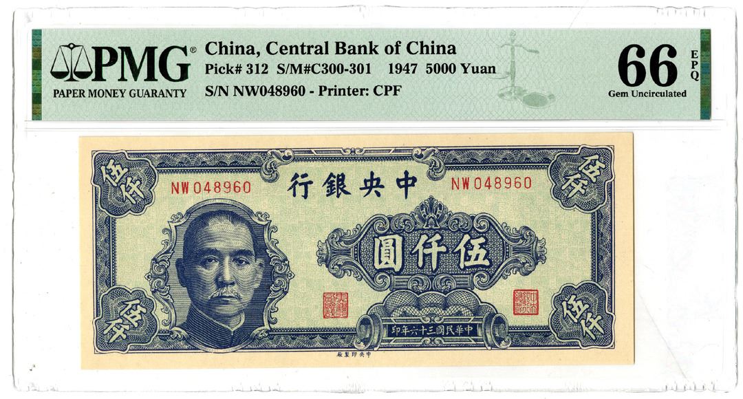 China. 1947. 5000 Yuan, P-312 S/M#C300-301, Issued banknote, blue on green, S/N NW048960, PMG graded Gem Uncirculated 66 EPQ. Printer: CPF.