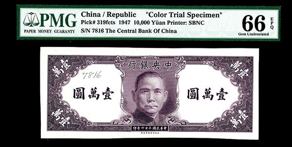 China, 10,000 Yuan, P-319fcts, Purple with no underprint instead of issued red-brown, SYS at center, PMG graded Gem Uncirculated 66 EPQ, very attractive and extremely rare as Color Trial. SBNC.