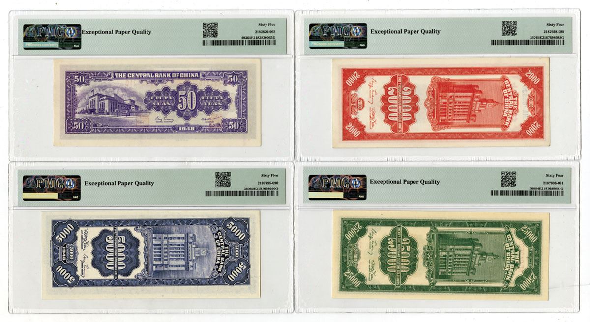 China, 1948. Lot of 4 Issued Banknotes, Includes: 2000 CGU, P-357 S/M#C301-60, S/N HA765938, PMG Choice Unc 64 EPQ, CPFA; 5000 CGU, P-360 S/M#C301-65, S/N 028624 Block 1-A, PMG Gem Unc 65 EPQ, SBNC; 25,000 CGU, P-366 S/M#C301-72, S/N NE842591, PMG Choice Unc 64 EPQ, CPF; and, 50 Yuan, P-403 S/M#C302-40, S/N AC497210, PMG Gem Unc 65 EPQ, CPF. (4). Sold "AS IS" no returns accepted.