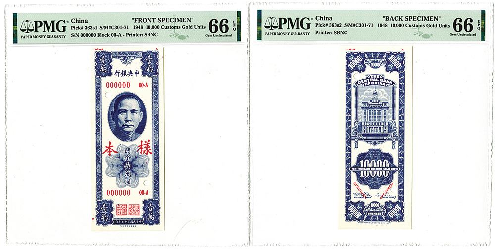 China, 1948. 10,000 CGU's, P-363s1 and P-363s2 Unlisted Color Trials (Not listed on PMG holders). Uniface Front and Back "Specimens", Face Blue with portrait of SYS in middle, back blue with bank building, red "00000" serial numbers, POC's. Both are PMG graded Gem Uncirculated 66 EPQ. SBNC. Rare note in high grade.
