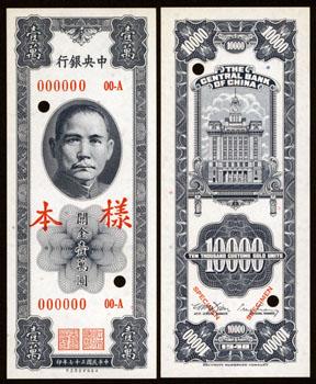 1948. 10,000 CGU, P-363 Unlisted Color Trial. Uniface specimen pair. Unlisted as specimen in pick. Uniface front & back specimens. No date on top margin. Duller blue color trial than previous example. Back of each specimen have "Specimen No." and unique number. Evidently a different color trial printing for evaluation. Choice uncirculated. Rare. SBNC.