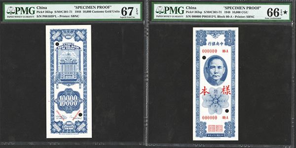 China, 1948. 10,000 Yuan, P-363sp. S/M#C301-71, Uniface Front and Back "Specimens", Face Blue with portrait of SYS in middle, back blue with bank building, red "00000" serial numbers, POC's. The face is PMG graded Gem Uncirculated 66 EPQ* and the back is Superb Gem Uncirculated 67 EPQ. SBNC.