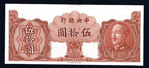Proof or Unfinished specimen, 50 Yuan, P-405 (S/M#C302-43), Red with no underprints or S/N's, CKS at right, Choice AU to Uncirculated condition, SBNC.