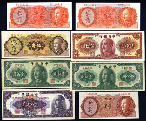 Lot of 8 notes, All are 1948 issues, Attractive group, 10 Cents to 100 Yuan, P-395 to P-406, XF to Choice Unc. From The Allen Berk Collection.