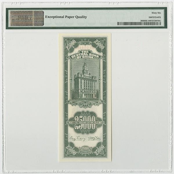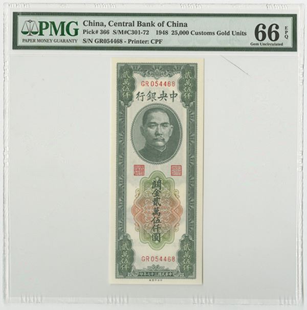 China. 1948, Issued 25,000 Customs Gold Units, P-366, S/M#C301-72, S/N GR054468, PMG graded Gem Unc 66 EPQ. CPF. Scarce in high grade.