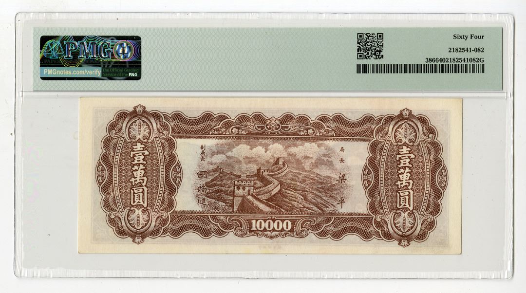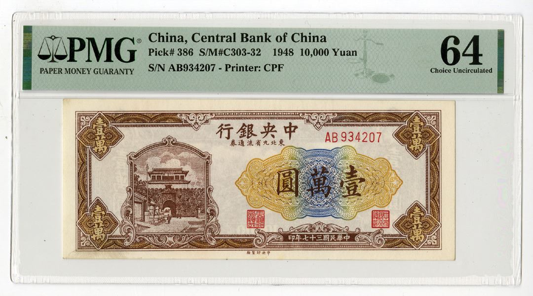 China, 1948. 10,000 Yuan, P-386, S/M#C303-32, Issued Banknote, Brown on m/c underprint, City gate at left, Back is brown with Great Wall of China, S/N AB934207, PMG graded Choice Uncirculated 64, Printer: CPF.