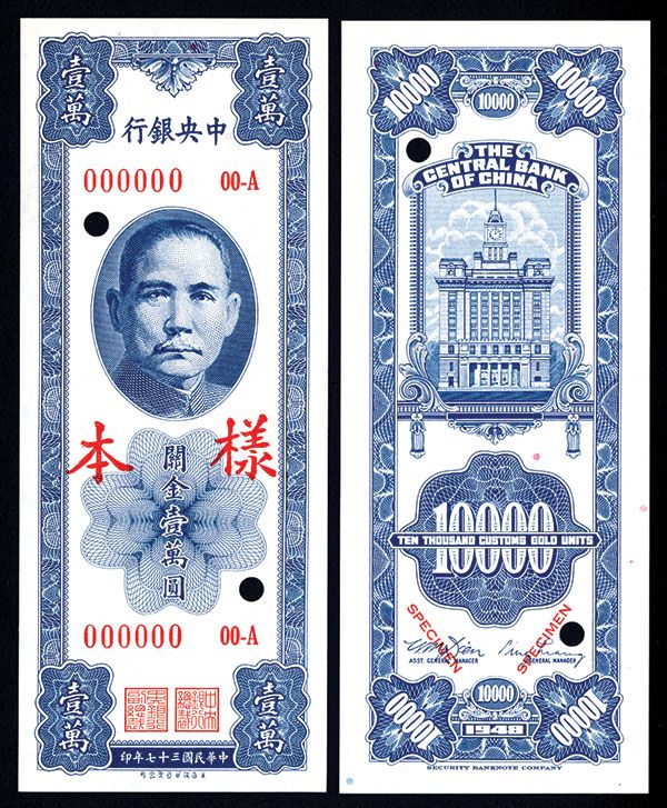 10,000 CGU, P-363 Unlisted. Uniface specimen front and back printed on planchetted security banknote paper. Unlisted as specimen in pick. Back of each uniface specimen has overprinted in red “Specimen No. P081021 *L or P081045*L”. Dark Blue. Subtle differences from issued colors. Choice to Gem uncirculated. Rare. SBNC.