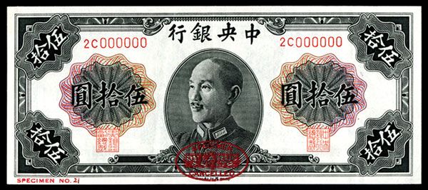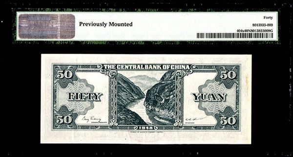 China, 50 Yuan, P-404 (S/M#C302-42), Unlisted Specimen banknote, Black on m/c, CKS in middle, S/N 2C 000000, Red Specimen oval in middle œSpecimen De La Rue Cancelled”, back gray-green with Yangtze Ganges at center, PMG graded Extremely Fine 40 NET with note of lightly previously mounted, the note appears in Choice Uncirculated but there are 4 very light vertical folds due to previous archival storage, otherwise bright colors, Sharp corners and large even margins only adds to this note. Rare note in any condition. TDLR. This is the only example listed in the PMG census, Population "1".