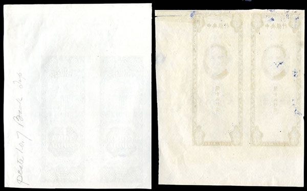 China, 1948), 5000 CGU, P-360 Unlisted Proofs, Uncut Pair of face notes and back notes, blue with no undertint with SYS at top center, back with Bank building at top center, The face proofs have a horizontal fold on the top margin from archival storage and would grade AU, large margins on right and bottom; backs are Choice AU to Unc. Large margins on top and right. Rare as proofs. Printed on white paper. SBNC.