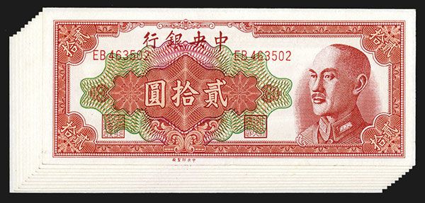 China, 20 Yuan, P-401, CKS at right, Lot of 10 sequential notes, all Unc to CU. CPF.