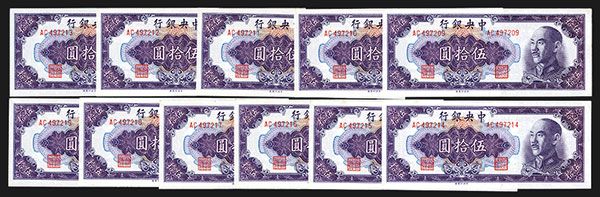 China, 50 Yuan, P-403, CKS at right, Lot of 11 notes, all Unc to CU. CPF.