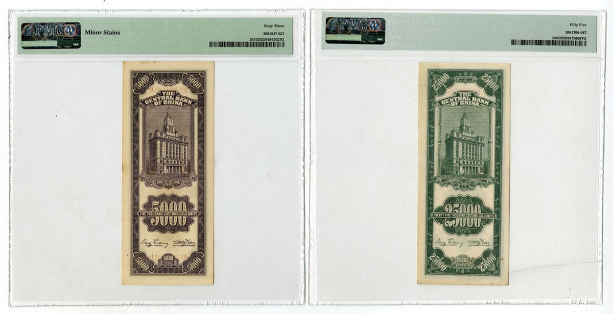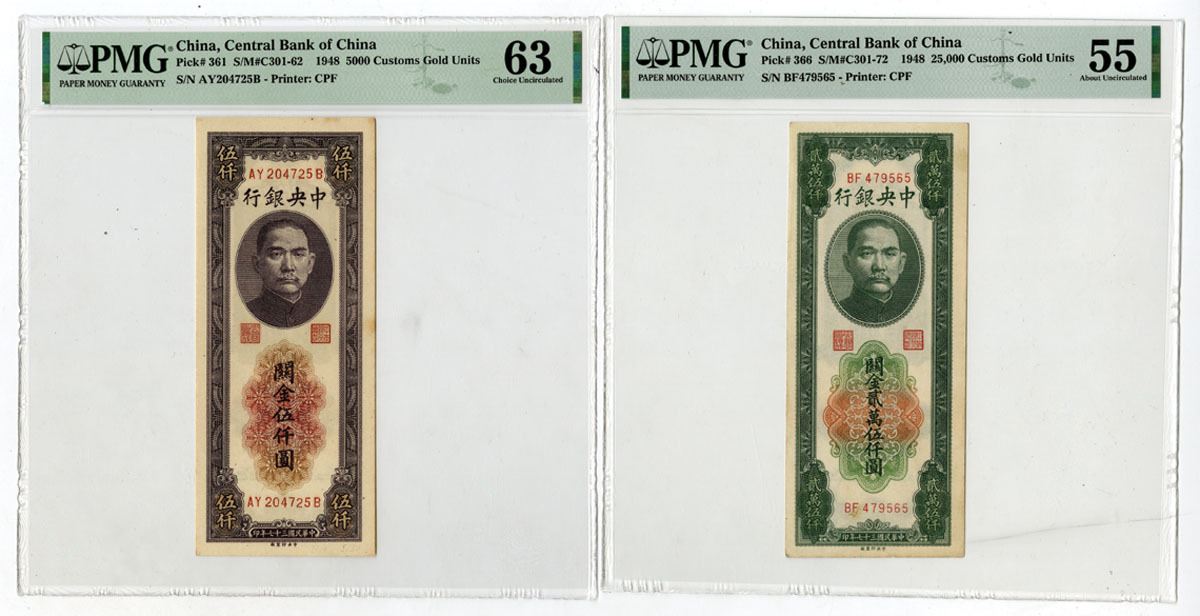 China, 1948. Lot of 2 Issued Banknotes, Includes: 5000 CGU, P-361 S/M#C301-62, Maroon on m/c underprint, S/N AY204725B, PMG Choice Unc 63 with comment "Minor Stains;" 25,000 CGU, P-366 S/M#C301-72, Green on m/c underprint, S/N BF479565, PMG About Unc 55. Both notes printed by CPF. (2). Sold "AS IS" no returns accepted.