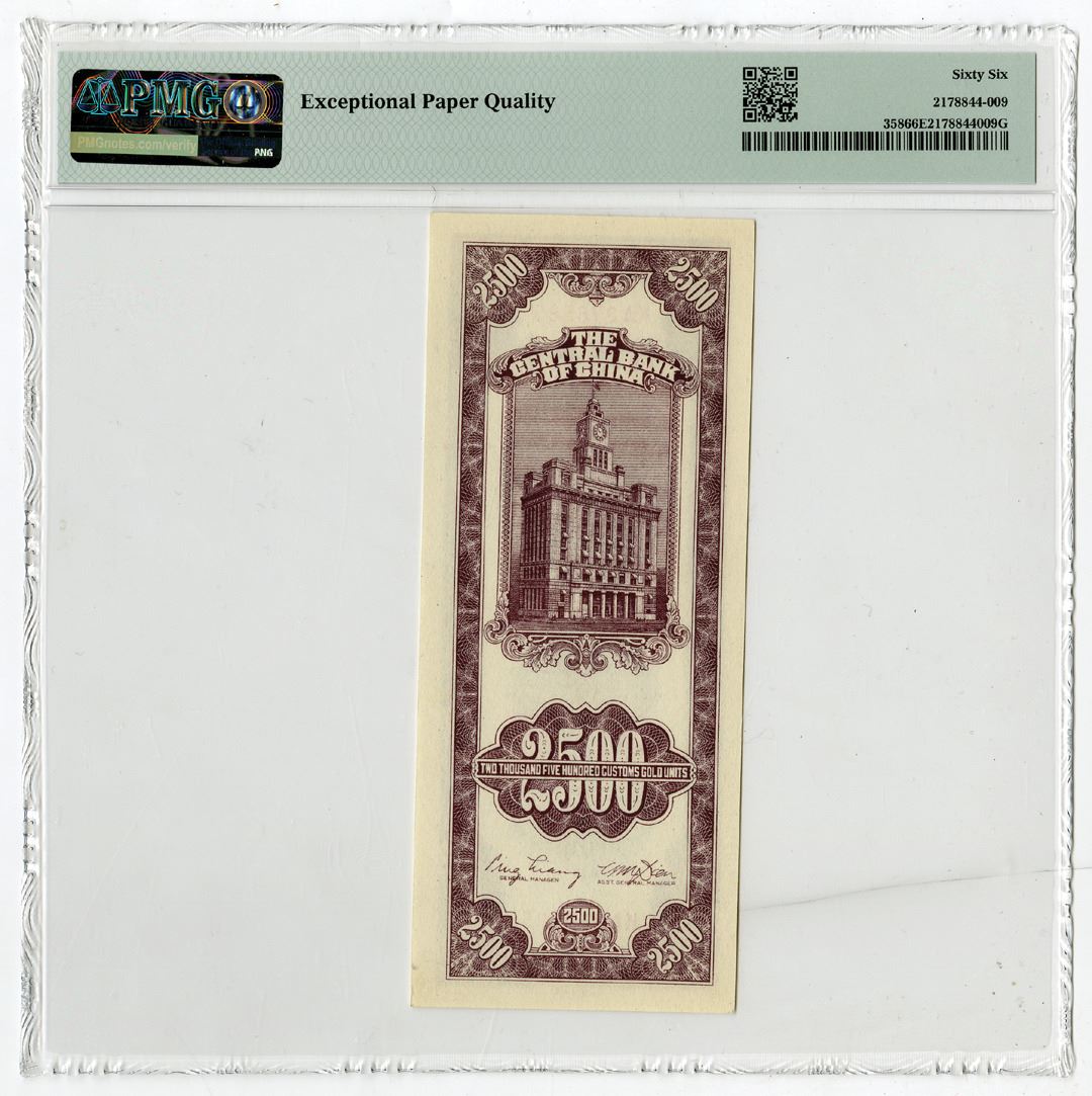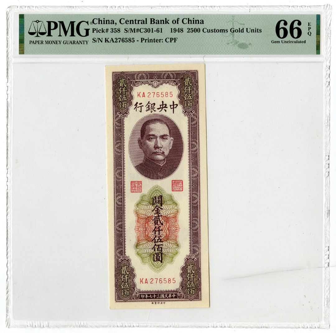 China, 1948. 2,500 Custom Gold Units, P-358, S/M#C301-61, Issued Banknote, Purple on m/c underprint with portrait of SYS at center, Note in vertical format, S/N KA276585, PMG graded Gem Uncirculated 66 EPQ, Printer: CPF.