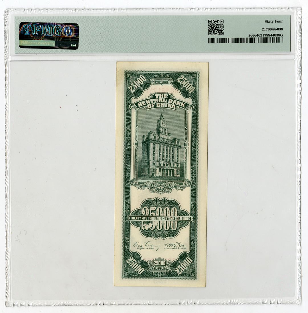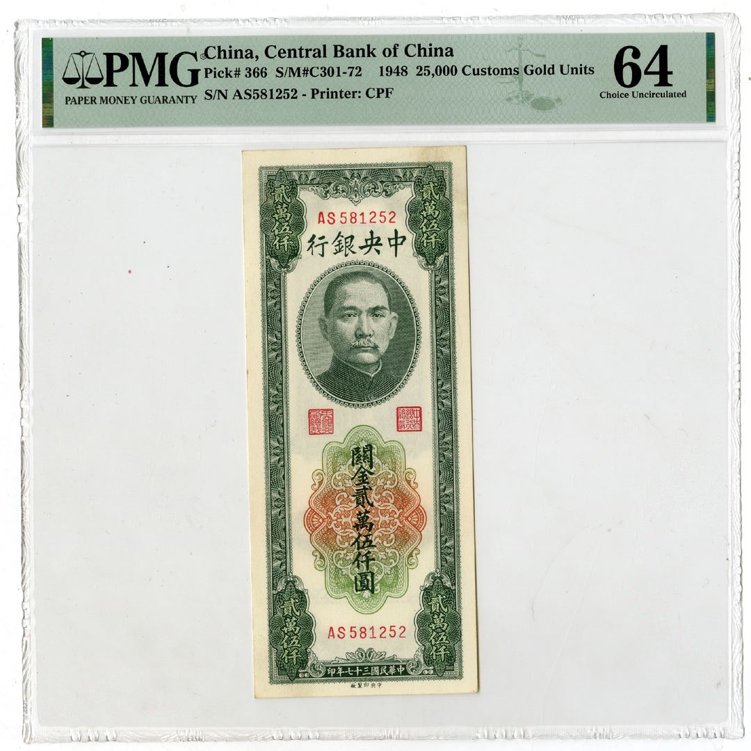 China, 1948. 25,000 Custom Gold Units, P-366, S/M#C301-72, Issued Banknote, Green on m/c underprint with portrait of SYS at center, Note in vertical format, S/N AS581252, PMG graded Choice Uncirculated 64 EPQ, Printer: CPF.