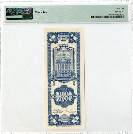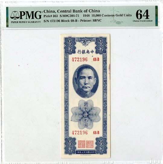 China, 1948. 10,000 Customs Gold Units, P-363 S/M#C301-71, Issued Banknote, Blue in vertical format, SYS at center, back blue with bank building, S/N 472196 Block 68-B, PMG graded Choice Uncirculated 64, SBNC. Scarce note with only 3 notes appearing at auction in the Track and Price Census.