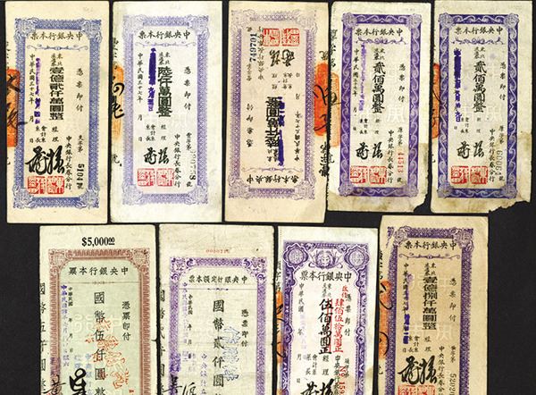 China. Changchung 2,000,000,- 120,000,000 Yuan; Kunming 300,000 Yuan; Chungking 1,000,000, 5,000,000 Yuan. P-449GH (2), 449K (2), 449L (2), 449P, 449U, 449V. S/M C302. Generally Fine, some with stains or paper loss. 9 pieces.