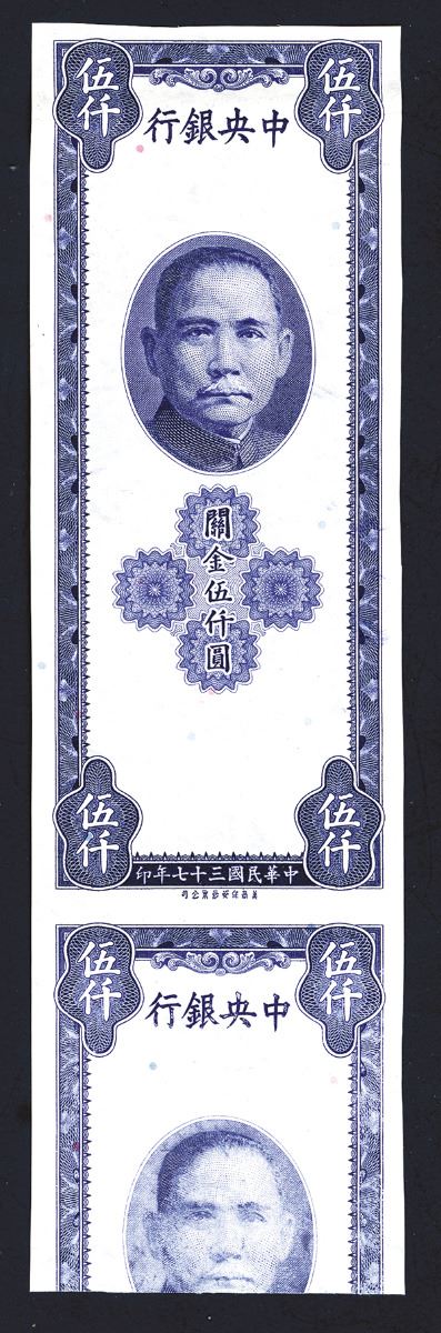 China. 1948. P-360 Unlisted. 5000 CGU's. Uniface face proofs. Large margins. The face has 1/2 of additional note on bottom that is partially inked. Printed on planchetted banknote paper. Choice uncirculated. SBNC.