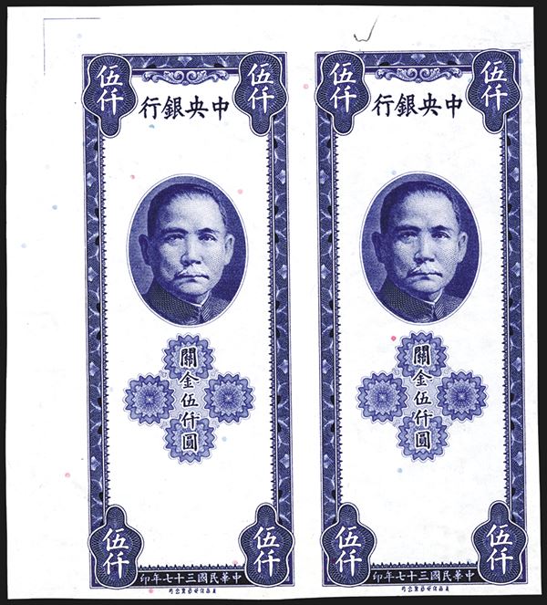 China, Lot of 2 banknotes (uncut pair) of the face, 1948, 5000 Yuan, P-360 Unlisted uncut Face pair, Printed on white planchetted paper, Uncirculated. SBNC.