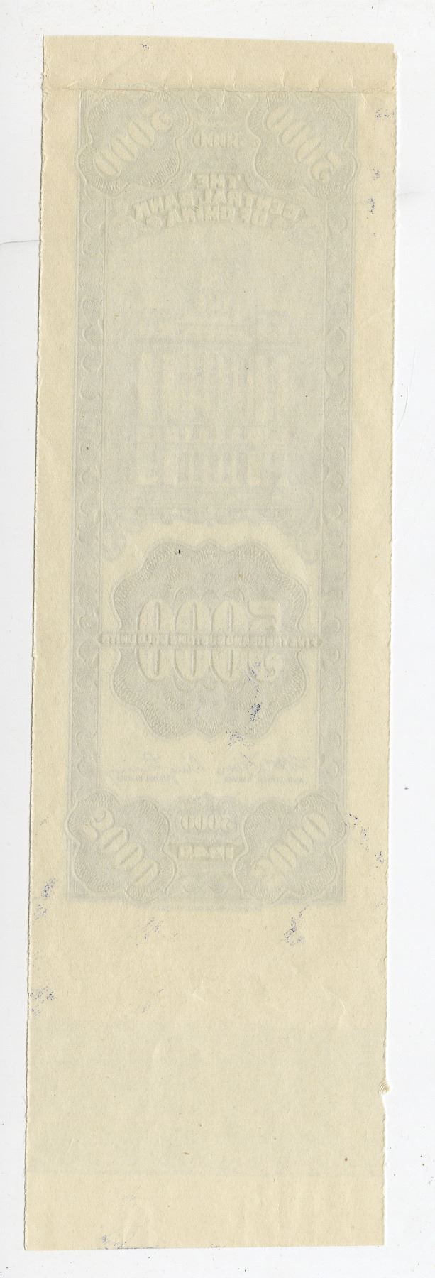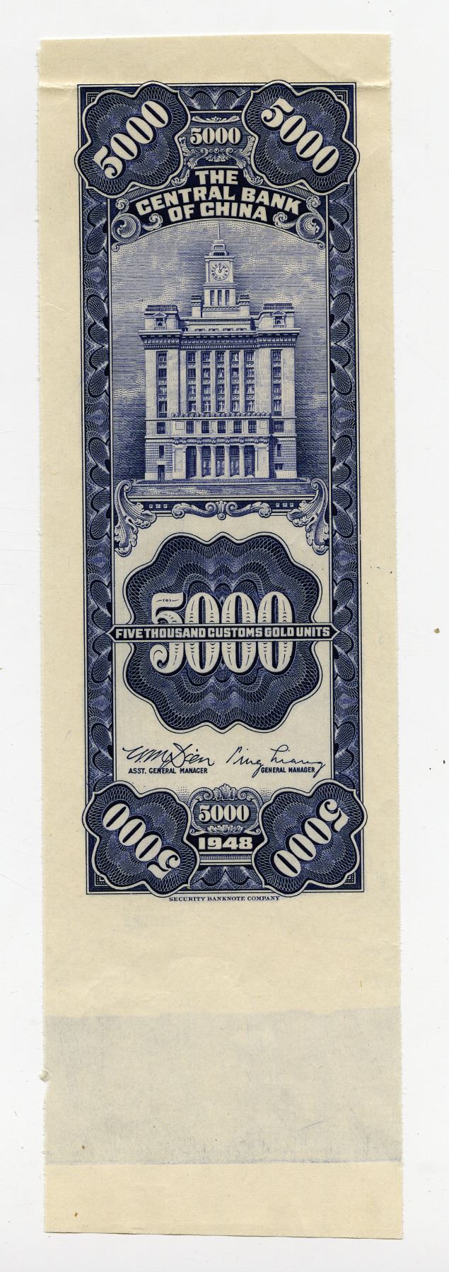 China, 1948. 5000 Customs Gold Units, P-360p, Uniface back proof with blue printing and bank building at center, Vertical format, Printed on thin white paper. AU condition due to 1 horizontal fold from archival storage, SBNC.