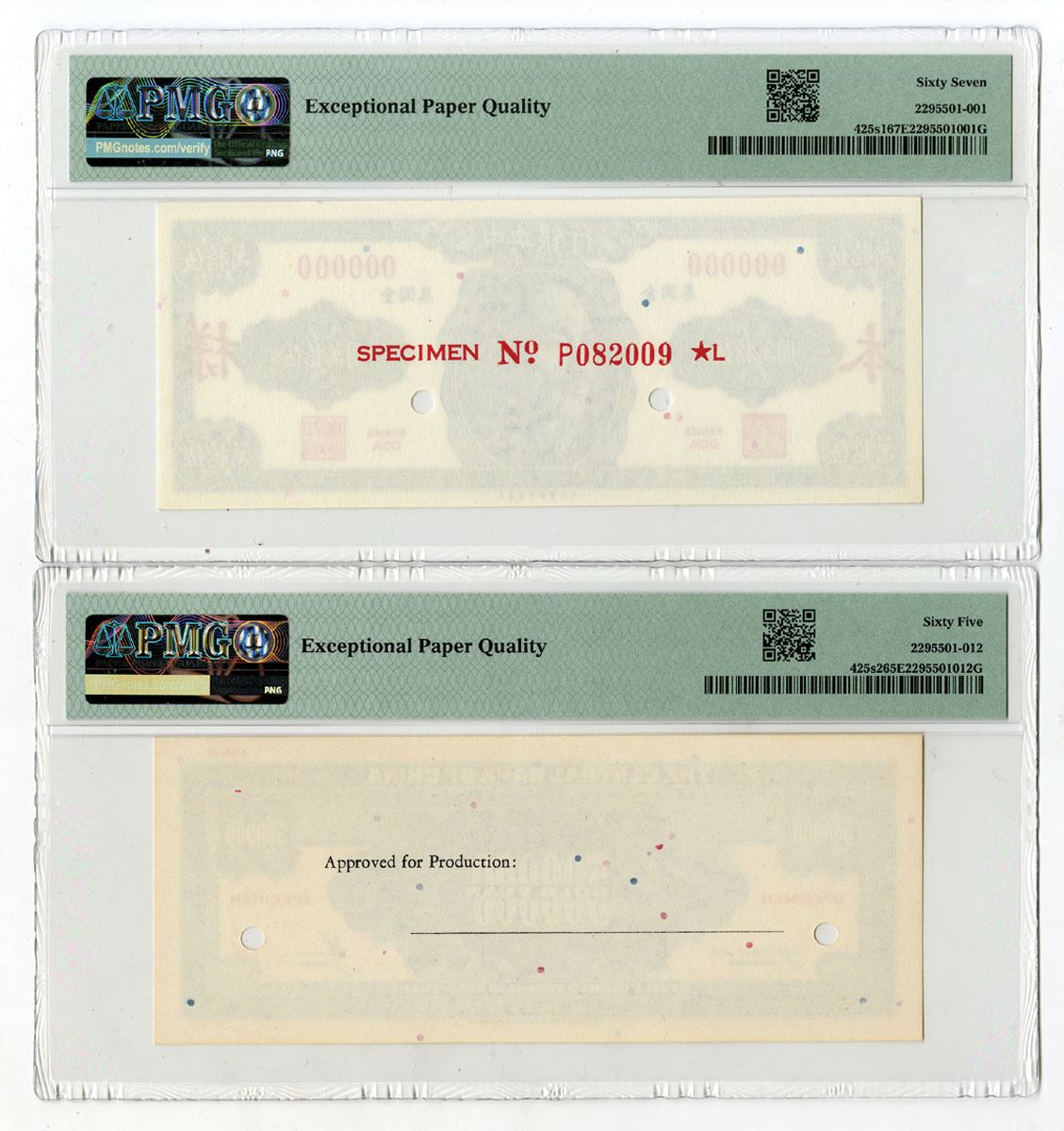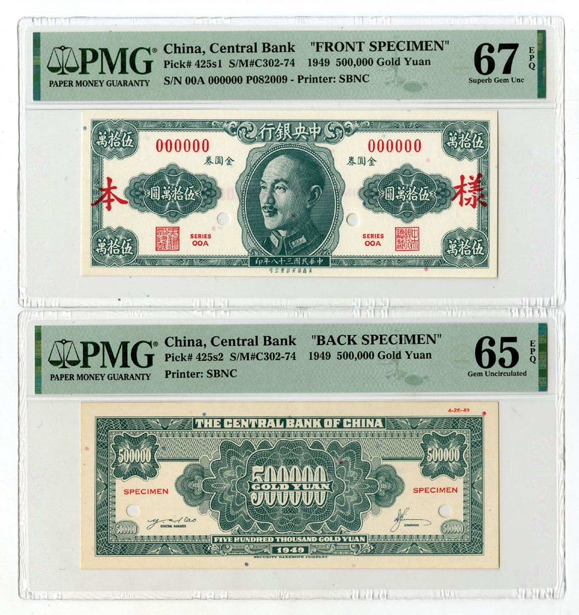 China, 1949. 500,000 Gold Yuan, P-425s1 & P-425s2 S/M#C302-74, Uniface Front and Back Specimen Banknotes, Front has green printing with SYS at center and back has denomination at center and at each corner, S/N 00A 000000 P082009, Specimen overprints and POCs, The back of each note has the text "Approved for Production", but unsigned. Both notes are PMG graded: Front is graded Superb Gem Unc 67 EPQ and Back is Gem Uncirculated 65 EPQ, SBNC. (2). Sold "AS IS" no returns accepted.