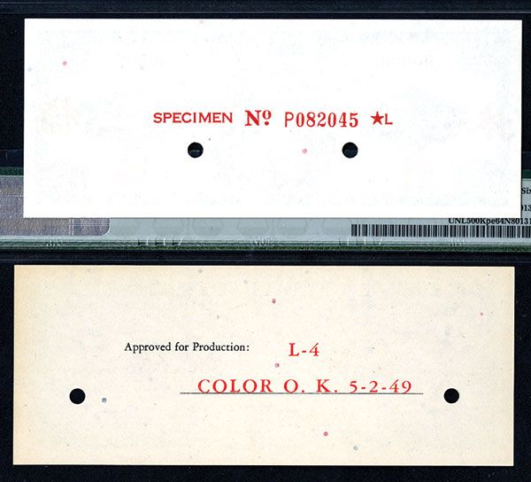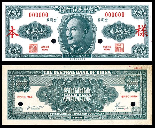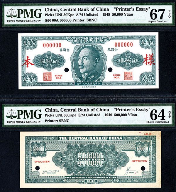 China, 1949. 50,000 Gold Yuan. Series 00-A. P-Unlisted. (designated P-UNL50Kpe) S/M#Unlisted, Uniface front and back specimen banknotes in green, CKS at center. Red specimen overprint, "00000" serial numbers and POC. The face is PMG graded Superb Gem Uncirculated 67 EPQ (Exceptional Paper Quality) and the back is Choice Unc. 64 EPQ. SBNC. Very possibly one of the finest known for this issue.