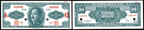 China, 1949, 50,000 Gold Yuan, Series 1-A, P-Unlisted, (Given P-420Apef and P-420Apeb by PMG) (S/M#302). Uniface front and back specimen banknotes in green, CKS in middle, Red specimen overprint, “00000” serial numbers and POC. Top right margin of front and backs have date 4-8-49. Backs have “Approved for Production” printed and red “L-4 Color O.K. 4-12-49” imprinted on back. The face is PMG graded Gem Uncirculated 66 EPQ and the back is PMG graded Superb Gem Uncirculated 67 EPQ. Extremely high grade for this rare note that will be difficult to improve upon. SBNC. Rare banknote.