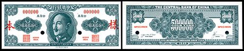 China, 1949, 500,000 Gold Yuan, Series OO-A, P-Unlisted, (Given P-425Apef and P-425Apeb by PMG) (S/M#302). Uniface front and back specimen banknotes in green, CKS in middle, Red specimen overprint, “00000” serial numbers and POC. Top right margin of front and backs have date 4-8-49. Backs have “Approved for Production” printed and red “L-4 Color O.K. 4-12-49” imprinted on back. The face is PMG graded Superb Gem Uncirculated 67 EPQ and the back is PMG graded Superb Gem Uncirculated 67 EPQ. Extremely high grade for this rare note that will be difficult if not impossible to improve upon. SBNC.