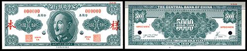 1949, 5000 Gold Yuan, Series 1-A, P-Unlisted, (Given P-415Apef and P-415Apeb by PMG) (S/M#302). Uniface front and back specimen banknotes in green, CKS in middle, Red specimen overprint, “00000” serial numbers and POC. Top right margin of front and back have date 3-30-49. The reverse of each has “Approved for Production”. The face is PMG graded Gem Uncirculated 65 EPQ and the back is PMG graded Superb Gem Uncirculated 67 EPQ. Extremely high grade for this rare note that will be difficult to improve upon. SBNC.