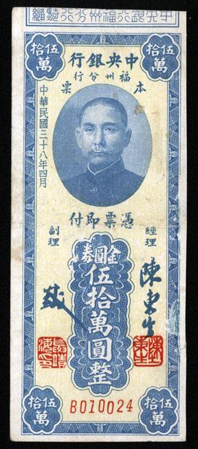 April 1949, 500,000 Yuan, P-450N (S/M #C302-90), Issued banknote, blue on yellow underprint, SYS center, One strong horizontal middle fold with 2 or 3 very light folds due to handling more than folding, there is also a small 1/2 inch area on the lower right border that has been scuffed off repainted back on that is barely noticeable. Rare note in any condition and this is a strong XF with minor faults.