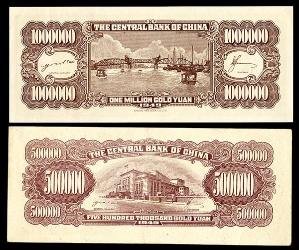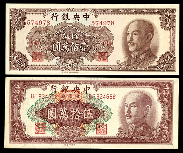 China, Lot of 2 notes, Includes 500,000 Yuan, P-424, AU and 1,000,000 Yuan, P-426, Choice Uncirculated and well centered. Scarce higher denomination notes.