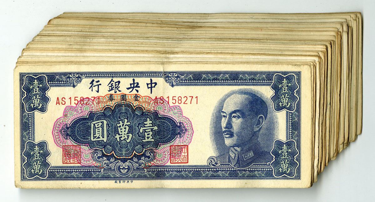 China. 1949. 10,000 Yuan, P-417 (62), Group of Issued Banknotes, Blue on multicolor underprint with portrait of CKS at right, Back is blue with bank building at left, Notes weight 1.8 oz. Notes range between VF to Choice VF or better. (62). Sold "AS IS" no returns accepted.