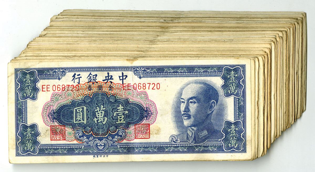 China. 1949. 10,000 Yuan, P-417 (65), Group of Issued Banknotes, Blue on multicolor underprint with portrait of CKS at right, Back is blue with bank building at left, Notes weight 1.9 oz. Notes range between VF and VF+ or better. (65). Sold "AS IS" no returns accepted.