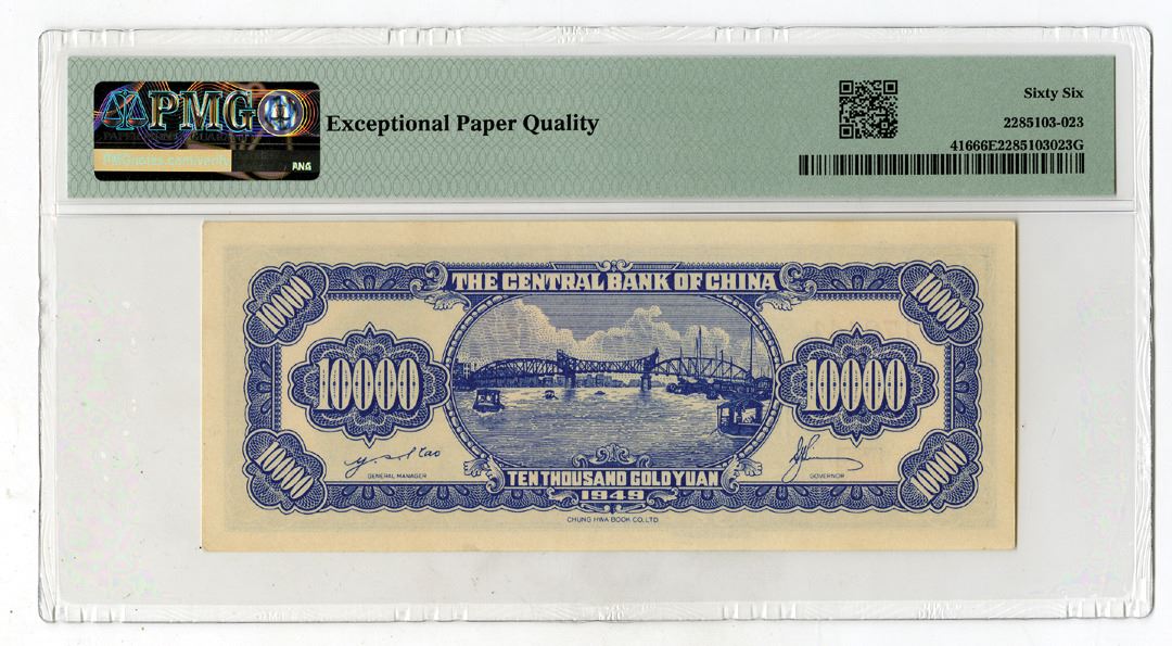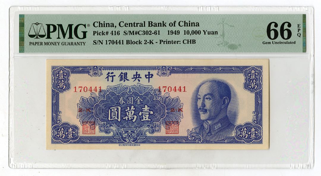 China, 1949. 10,000 Yuan, P-416 S/M#C302-61, Issued Banknote, Dark blue on light blue and pink underprint with CKS at right, Back is blue with bridge at center, S/N 170441 Block 2-K, PMG graded Gem Uncirculated 66 EPQ, CHB.