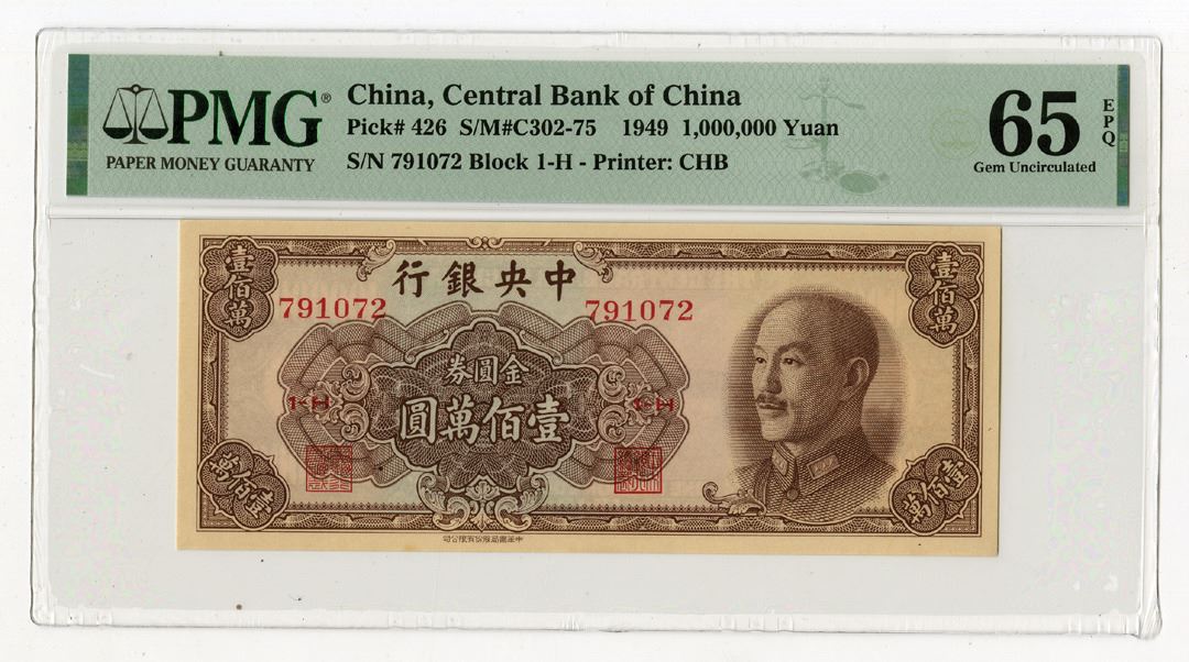 China, 1949. 1,000,000 Yuan, P-426 S/M#C302-75, Issued Banknote, Brown on pale pink and blue underprint with CKS at right, Back is brown with bridge over river at center, S/N 791072 Block 1-H, PMG graded Gem Uncirculated 65 EPQ, CHB